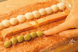 まな板の上に、ラップを広げ、3)の肉を15×20cmの長方形に広げ、中心に2)のハムとオリーブ、ゆでて白身を少し切り落としたうずら卵をのせ、種になじむように上から押す(B)。 |