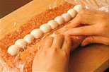 のり巻きの要領で、中の空気をしっかり抜きながら手でトントンたたいて巻く(空気をしっかり抜かないと肉と具がはがれて失敗する)(C)。 |