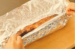 アルミ箔に包んで、タオルまたは新聞紙でくるみ、肉汁が落ちつくまでそのままおく(あわてて熱いうちに切ると肉汁が出てしまう)(F)。