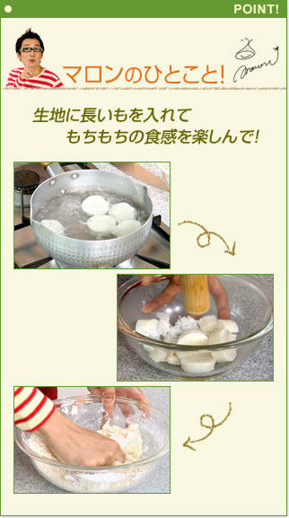 長さ2cmに切った長いもを10分ほどゆでて水気を取り、ボウルに入れて麺棒などでねばりが出るまでつぶし、粗熱がとれたら冷蔵庫へ。 |