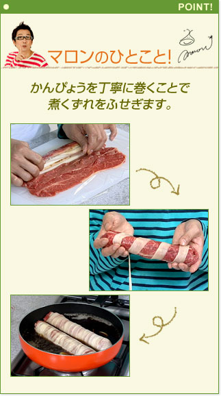 3に1のかんぴょうを最初は粗いらせん状に巻きつけ、重ねて包帯巻きにして、巻き終わりを楊枝で留めます。残りも同様にします。 |