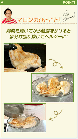 フライパンにサラダ油を入れて強めの中火で熱し、鶏肉を皮を下にして並べて焼きます。両面に焼き色をつけザルに取って熱湯を回しかけ、脂抜きをします。 |