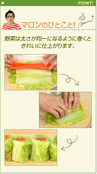 白菜の葉2枚を少しずつずらして重ね、芯2枚を厚さが均一になるように重ねます。手前にニンジン2本をのせて巻き、4等分に切り、形を整えながら水気を絞ります。残りの白菜、ニンジンも同様にします。 |