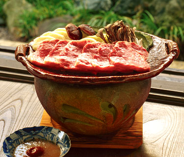 | 6) | Grease ceramic plate with cooking oil. Roast the beef and vegetables prepared from (1) through to (3). Dip into the seasoned sake prepared in (5) before eating. |