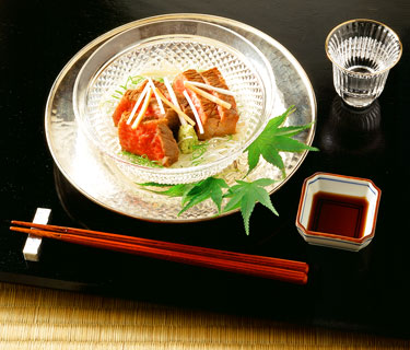 | 6) | Spread leek and ginger on a dish, place the beef cut in (5), garnish with udo and carrot prepared in (4) and serve with grated wasabi. |