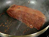 | 2) | Place the beef prepared in (1) in a very hot frying pan and brown the surface. Plunge the beef in ice water. Take the beef out when sufficiently cooled, wrap inside a paper towel and set aside. |