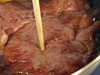 箸で牛肉を押してみて、すっと箸が入ったら火が通り過ぎです。少し箸が通りにくい程度でいったん引き上げます。