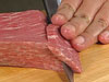 牛肉は、寿司ネタとして握れる大きさに、斜めに薄く、包丁を引くようにして切ります。