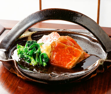 | 2) | 牛肉を十分に熱したフライパンに入れ、表面に香ばしく焼き色をつけます。1の蒸し地に入れてペーパータオルで落としぶたをし、蒸気のたった蒸し器に入れて10分間蒸します。 |