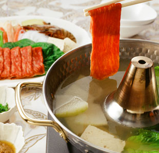 | 5) | 4をしゃぶしゃぶ鍋にうつし、牛肉と具を入れてゆでながら器に取り、3のたれと香菜を入れて、つけながらいただきます。 |