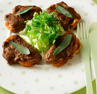 | 1) | 牛肉の上にラップをのせ、麺棒などでたたいて3〜5mm厚さに広げて、軽く塩、こしょうと小麦粉をまぶしたら生ハム2枚とセージ1枚をのせて半分に折り、楊枝で止め、さらに両面に塩、こしょうをまぶします。 |