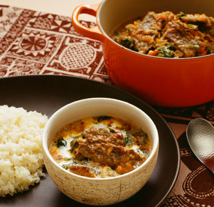 肉(ニャマ)の煮込みに、青汁の原料として知られる、苦味のある葉物野菜「ケール」(スクマ)の炒め物を添えたもの。ケニアでは、トウモロコシの粉を練った、主食のウガリと一緒に手で食べます。