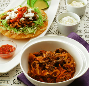 トウモロコシの生地を焼いた、メキシコ料理の基本であるトルティージャを油で揚げたのがトスターダス。レタスやアボカド、そして煮込んだ牛肉をのせれば、彩りも良くボリュームたっぷりのメインメニューに。