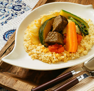 クスクスは、細かい粟粒状の世界最小のパスタ。肉や野菜などを煮込んで香辛料をきかせた煮汁をかけたものが、北アフリカの伝統的なクスクス料理です。宗教上の安息日にあたる金曜日には、多くの人が食べるメニューです。